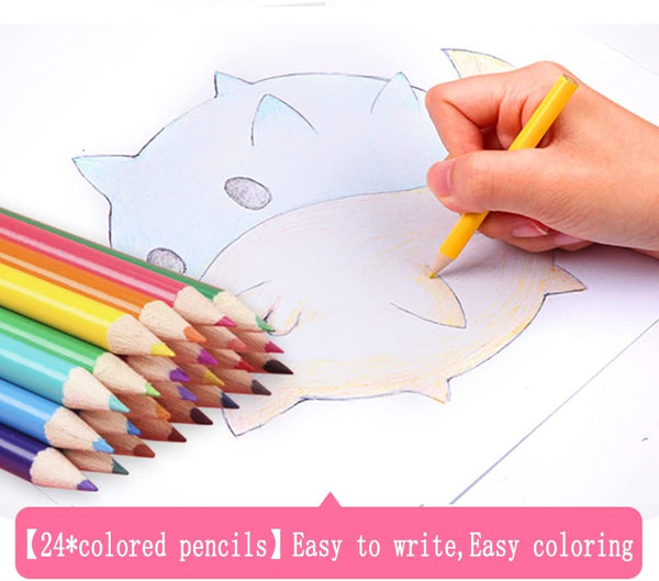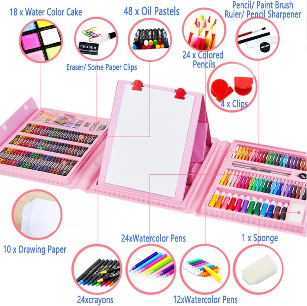 Incluye pasteles al óleo, crayones, lápices de colores, acuarelas en pastilla, rotuladores, papel de dibujo, borrador, sacapuntas y un caballete trifold doble cara listo para usar.